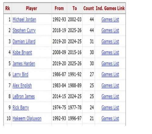 值得一提的是,乔丹30岁后得分40+次数的纪录也极可能被库里打破,乔丹做到了44次,库里目前也是44次,两人并列历史第一。除了他俩外,利拉德做到31次排名历史第二,科比、哈登30次排名历史第三。